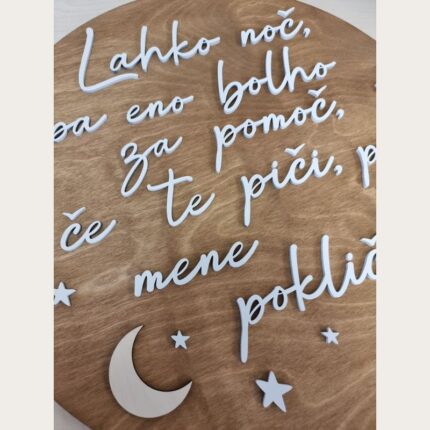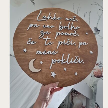 Lesena tabla lahko noč Debelina: 6mm Velikost kroga: 50 cm Izdelana iz kakovostnega lesa, idealna za dekoracijo in trajen spomin. Opozorilo: Izdelek ni igrača, namenjen je izključno dekoraciji. Z njim ravnajte previdno. Les je naravni materijal zato barve in izdelki lahko odstopajo od izdelkov na sliki in niso razlog za reklamacijo. Čas izdelave: 5 - 10 delovnih dni