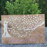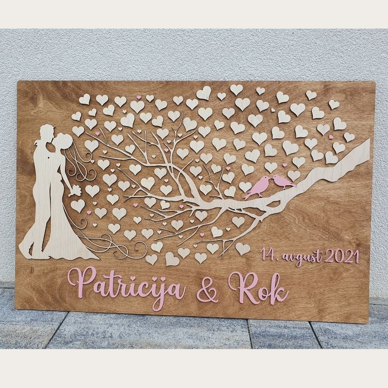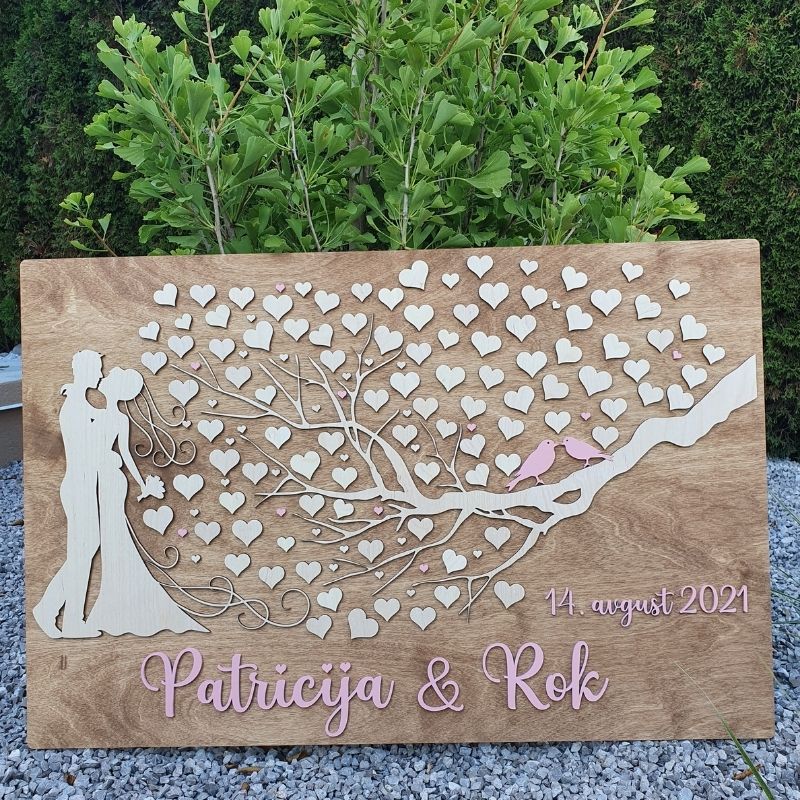 Poročna tabla drevo s srčki je edinstvena dekoracija, kjer gostje dodajo svoj podpis na srčke kot simbol ljubezni in povezanosti. Idealna za ustvarjanje nepozabnih spominov in dodajanje osebne note poročni ceremoniji.