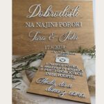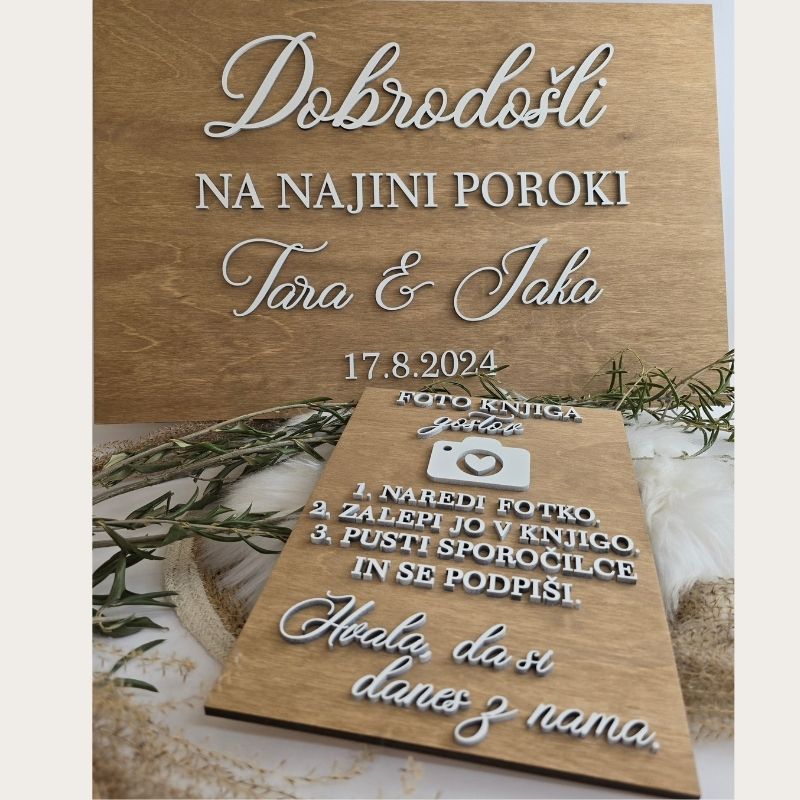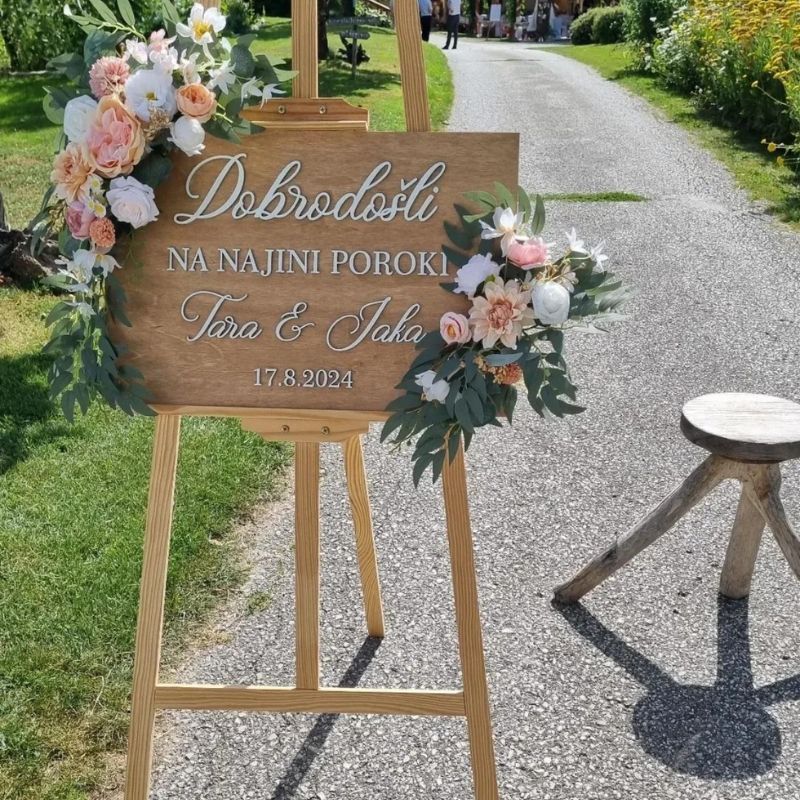 Začnite svoj poročni dan s čudovito leseno tablo dobrodošlice, ki vsebuje ime mladoporočencev in datum poroke. Ta elegantna in personalizirana tabla je popoln način, da pozdravite svoje goste in jih usmerite na praznovanje ljubezni. Leseni material daje rustikalni pridih, ki se poda k vsakemu slogu poroke, od klasičnega do modernega.