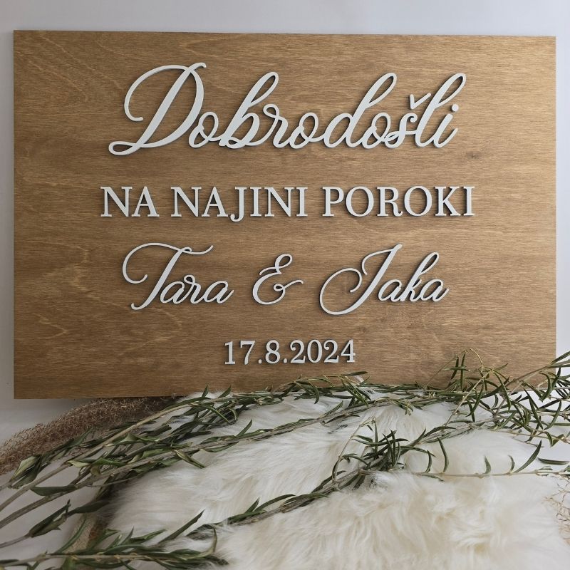 Lesena tabla dobrodošlice za poroko z imenom mladoporočencev in datumom